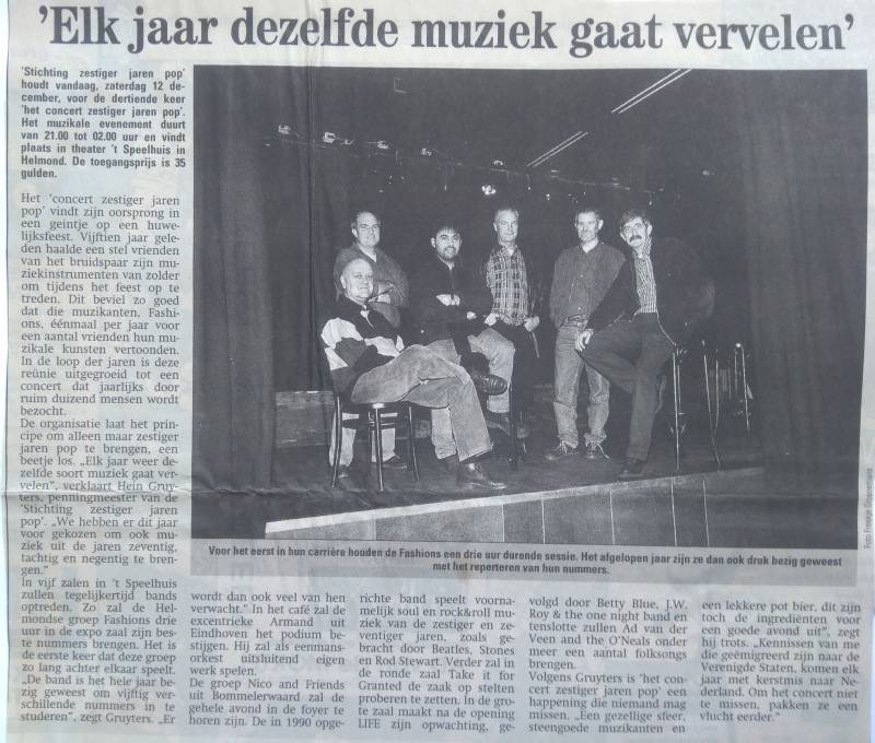 Als het op anekdotes en bijzondere gebeurtenissen aankomt dan kan Cor een boek schrijven. “Wie weet is het wel eens een optie om daar over na te denken. Ik bewaar namelijk alles en bij elke foto heb ik wel een herinnering”, zegt de leadzanger van The Fashions. Het jubileumconcert op 27 oktober begint om 16.00 uur. Kaarten kosten 5 euro bij voorverkoop, 7,50 euro aan de kassa.